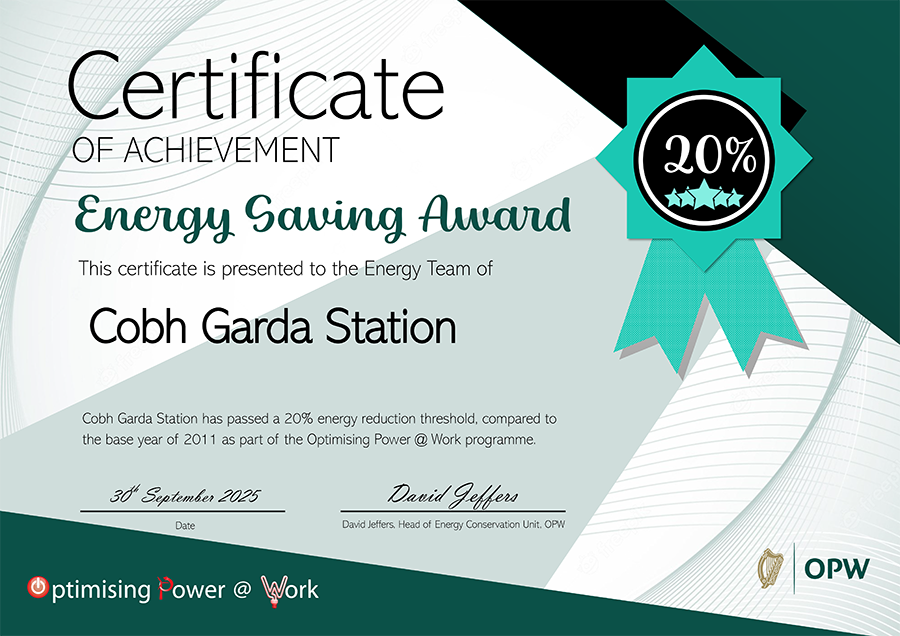Thomas O Connor was appointed as being Cobh Garda Station’s OPW Energy Advisor since 2019, helping to promote the ‘Optimising Power @ Work’ energy conservation campaign.