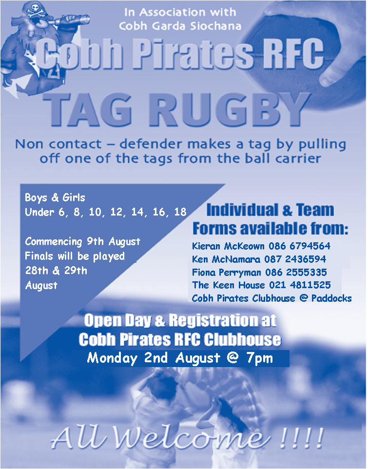 In association with Cobh Garda Siochana, Cobh Pirates RFC bring you ‘TAG RUGBY’. Aimed at age groups from 6 to 18 and commencing on 9th August with the finals played on 28th & 29th this event is a must for all. This is a Non-contact game whereby you make a ‘TAG’ by pulling one of the tags from the ball carrier. An open registration session will be held at the Cobh Pirates ground at 7.00pm on Monday 2nd August. ALL WELCOME. Please see poster for further details.
